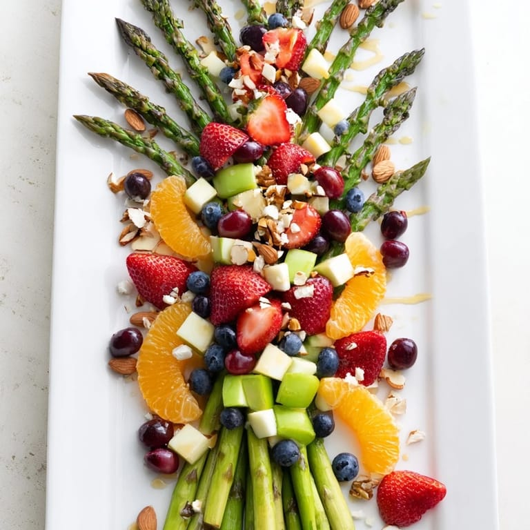 Arrange the asparagus stems as branches on a large board and artistically surround them with fruit pieces. Provide small tongs or skewers for easy individual serving.