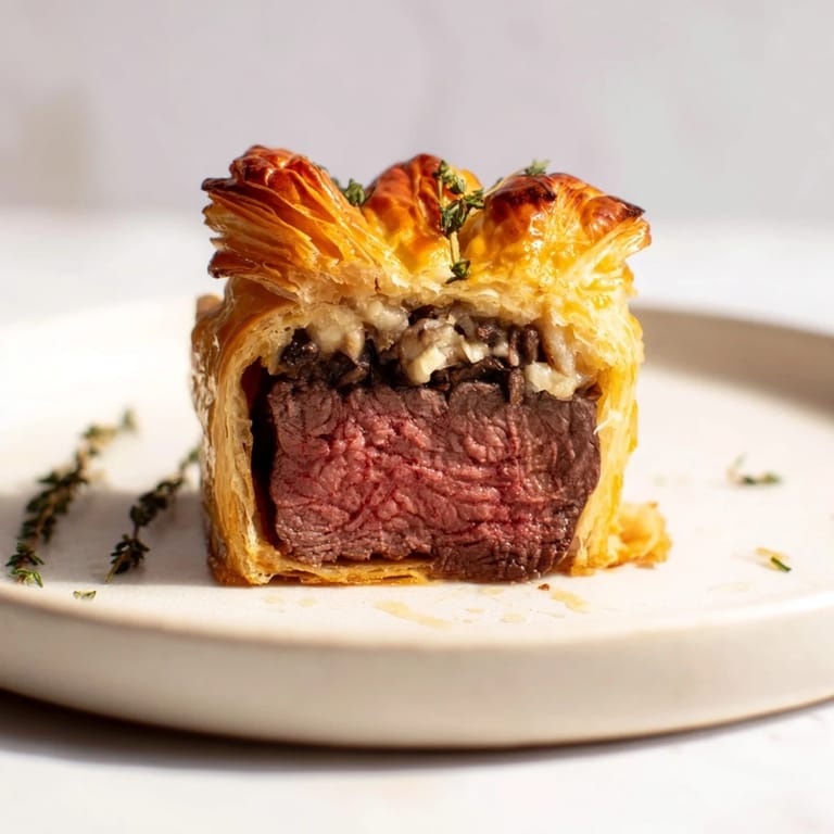 Pin Tender beef wrapped in golden puff pastry, infused with mushroom duxelles and festive herbs perfect as elegant party appetizers.