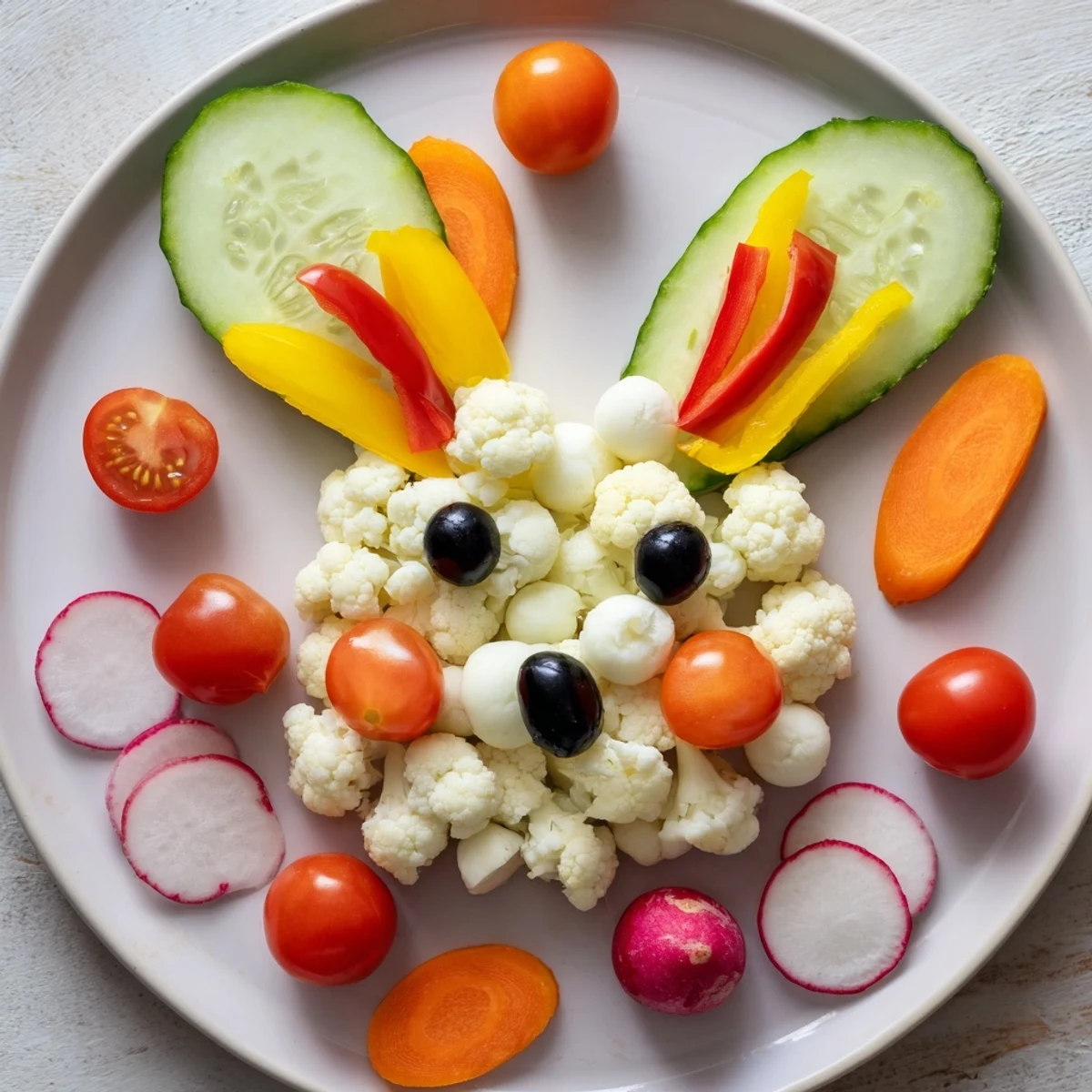 Cucumber rounds form the face and ears, while cherry tomatoes, olives, and bell pepper strips add detailed features. Cauliflower and mozzarella balls provide texture for the bunny’s face.