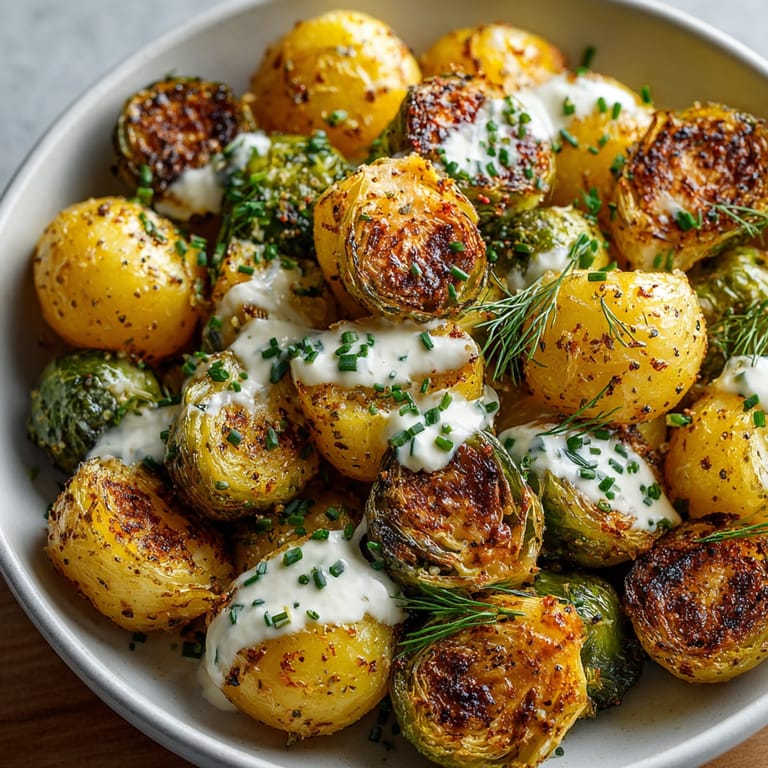 Pin This vibrant side dish combines the unexpected tang of pickle seasoning with perfectly roasted Brussels sprouts and potatoes, all finished with a creamy ranch drizzle. I stumbled upon this flavor combination during a creative kitchen experiment, and it's been a requested favorite at family gatherings ever since.
