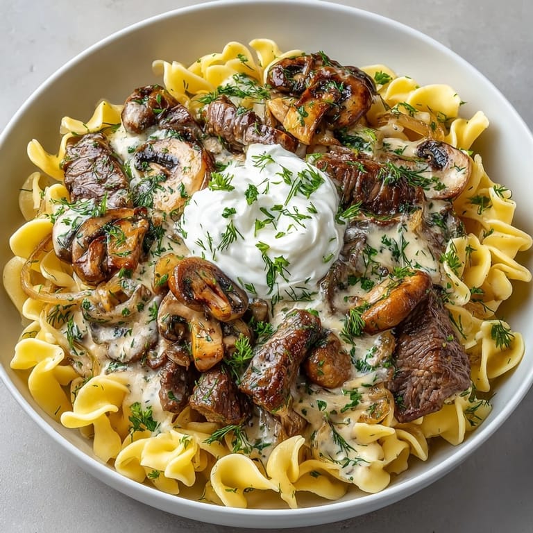 Pin This comforting beef and mushroom stroganoff is my go-to recipe when the family craves something soul-warming but still quick to prepare. Tender strips of beef mingle with savory mushrooms and onions in a lusciously creamy sauce, all spooned over buttery egg noodles. Every bite brings nostalgia and richness, making it a favorite for cool nights or when you want classic homemade comfort.