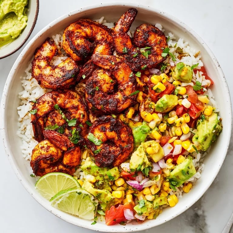 Pin A vibrant, flavor-packed bowl featuring spicy blackened shrimp, creamy avocado corn salsa, and fluffy rice is a fresh and satisfying meal with a Southwestern twist.