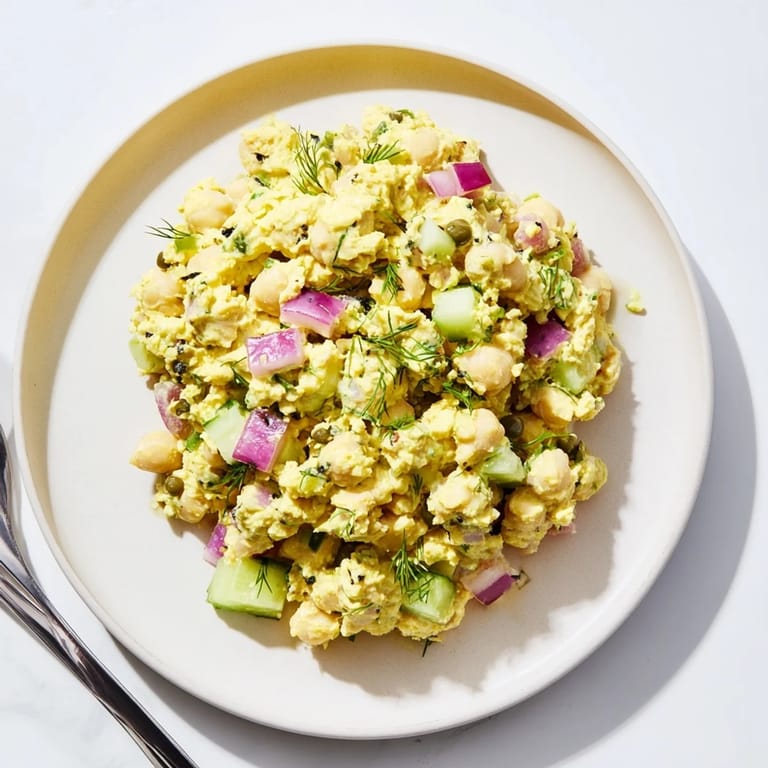 Pin A vibrant, plant-based twist on classic tuna salad, featuring mashed chickpeas and a touch of seaweed for an authentic ocean flavor. Perfect for sandwiches, wraps, or salads.