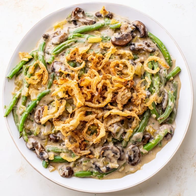 Pin A nostalgic creamy side dish featuring tender green beans savory mushrooms and crispy fried onions a classic for holiday feasts and family dinners.