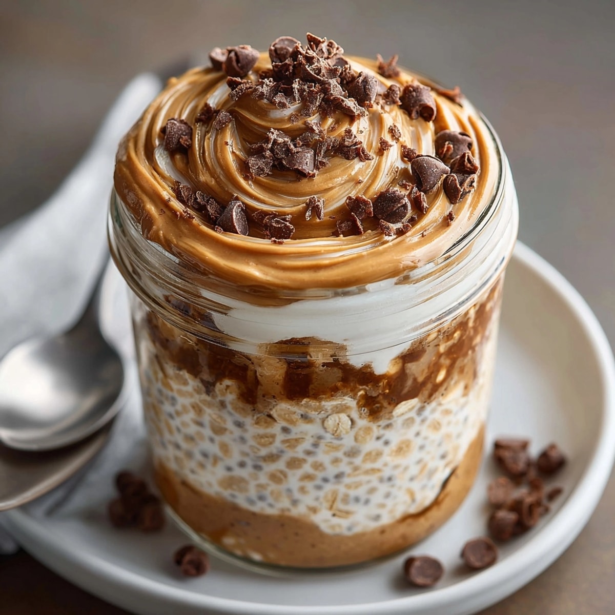 - Open jars stir the oats well to combine layers and add an extra dollop of peanut butter or more chocolate chips on top Eat straight from the jar with a spoon cold and creamy