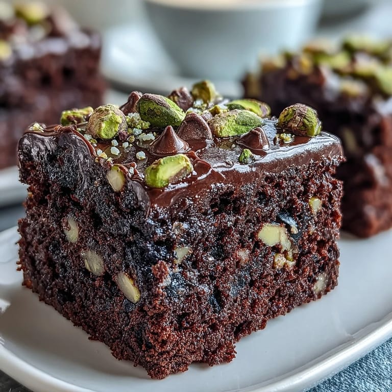 The ratio of wet to dry in this recipe creates that coveted fudgy density without being gummy—it's a sweet spot that happens because the butter-to-sugar ratio is generous, and the chocolate and pistachios add enough structure to keep everything from spreading thin. The cocoa powder doesn't dry things out the way you might expect because the melted butter keeps everything moist and luxurious.