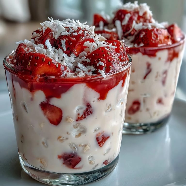 Pin The magic happens overnight as chia seeds and rolled oats soak up the creamy coconut milk, creating a pudding-like texture that's both satisfying and nourishing. Fresh strawberries macerated with a touch of lemon juice and maple syrup form pockets of fruity sweetness throughout, while the coconut yogurt topping adds an extra layer of decadence. This is breakfast that feels like dessert, but fuels you like a champion.