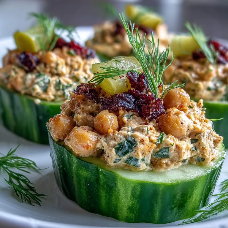 Pin My roommate challenged me to veganize her grandmother's famous tuna salad, and honestly, I was skeptical until I realized chickpeas have this satisfying, meaty texture that works beautifully with briny pickles and sharp mustard. The first time I scooped that creamy mixture into crisp cucumber boats, something clicked—it felt elegant enough for guests but quick enough for a Tuesday lunch. Now whenever I need something that feels fancy without the fuss, this is what I reach for.